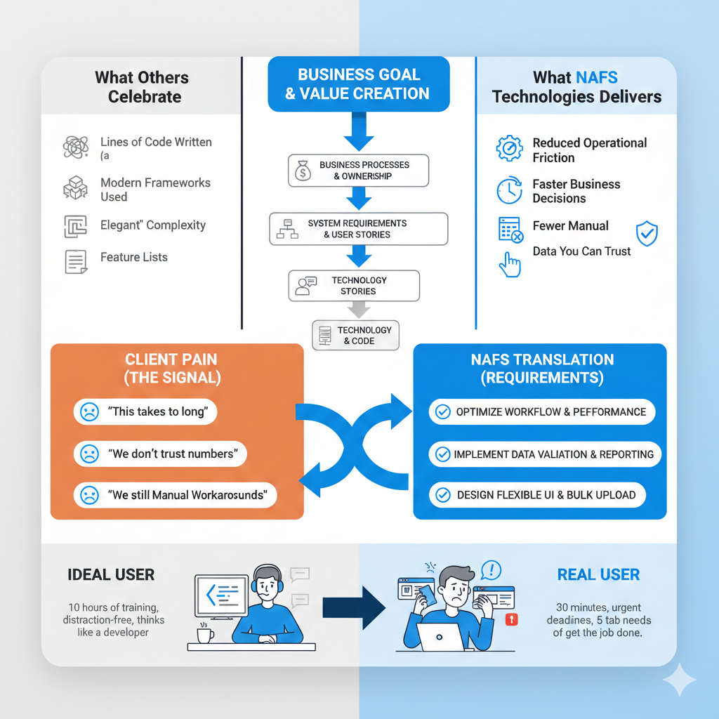 At NAFS Technologies, we are drawing a line in the sand. This isn’t just a process—it’s a commitment. We believe software exists to serve people under real-world constraints, not to serve the egos of the people writing it.