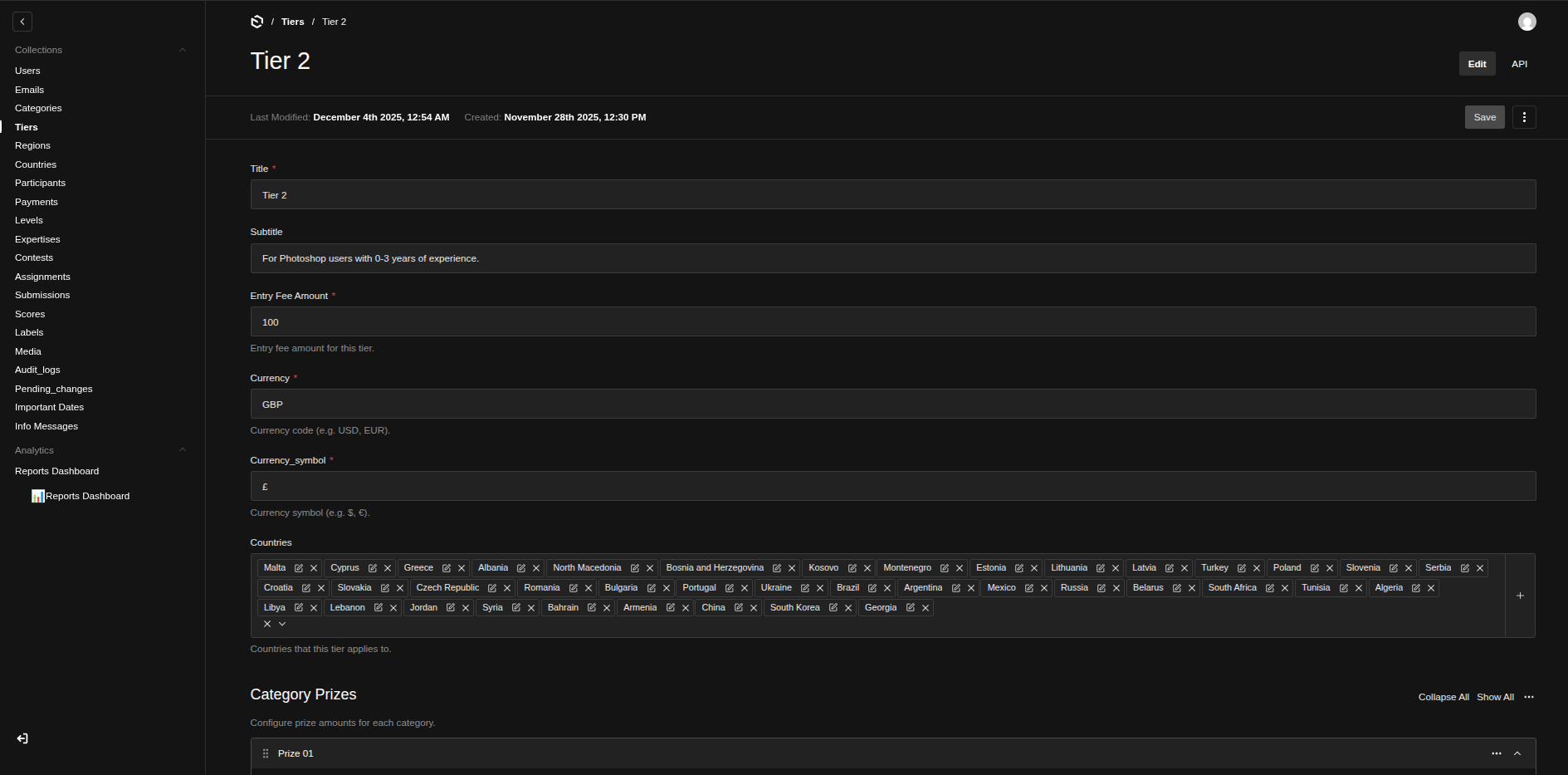 Modeled contest entities in Payload: Countries, Phases, Contests, Categories, Entries, Submissions, Reviews, Users, Reports.